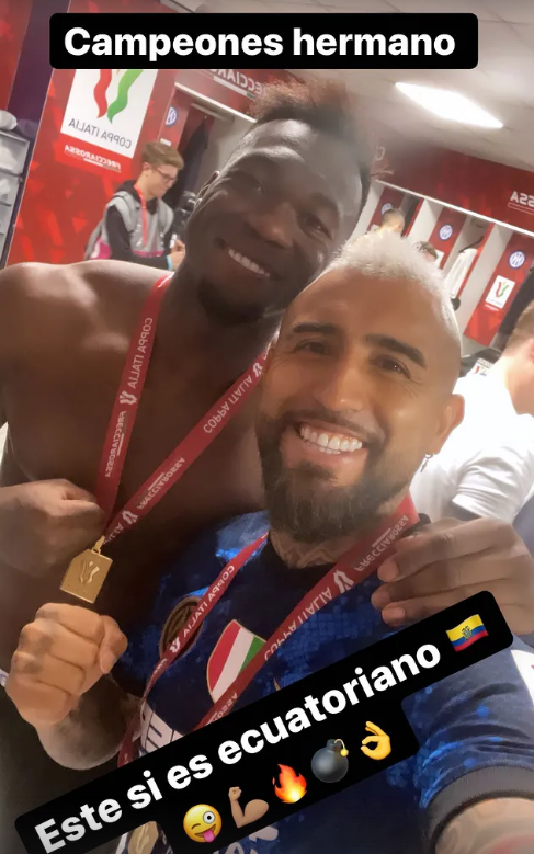 En el camerino, Vidal se tomó una fotografía con ‘Felipao’ y aprovechó para colocarle ‘picante’ a la polémica con Castillo. “Campeones hermano, este sí es ecuatoriano”, escribió, en una publicación con emoticones como indirecta a lo que ocurre con el seleccionado nacional, quien es acusado por los chilenos de ser colombiano.