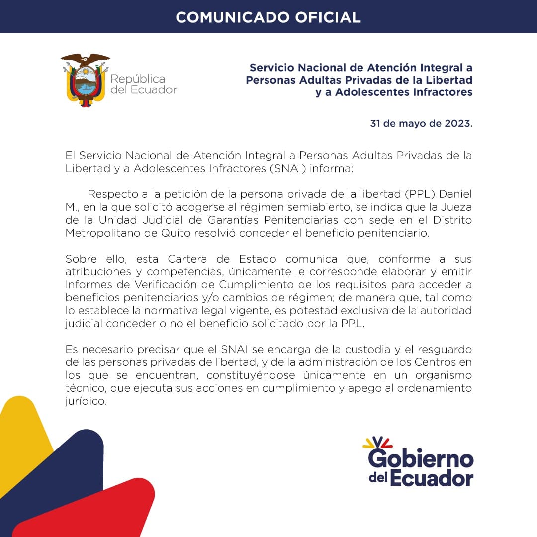 A través de un comunicado, la entidad informó que la jueza de la Unidad Judicial de Garantías Penitenciarias de Quito resolvió otorgarle el régimen semiabierto tras cumplir el 60% de su pena; mismo que Mendoza buscaba desde 2021.