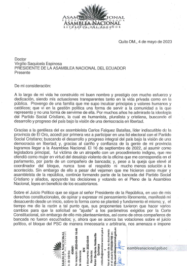 En la misiva enviada este jueves, 04 de mayo de 2023, la asambleísta señala que tras expresar su inconformidad por el juicio político que se sigue contra el presidente Guillermo Lasso, pero no fueron escuchados. “Ahora que se acerca la votación el PSC nos amenaza e impone decisiones, sin siquiera socializarlas”, enfatizó.