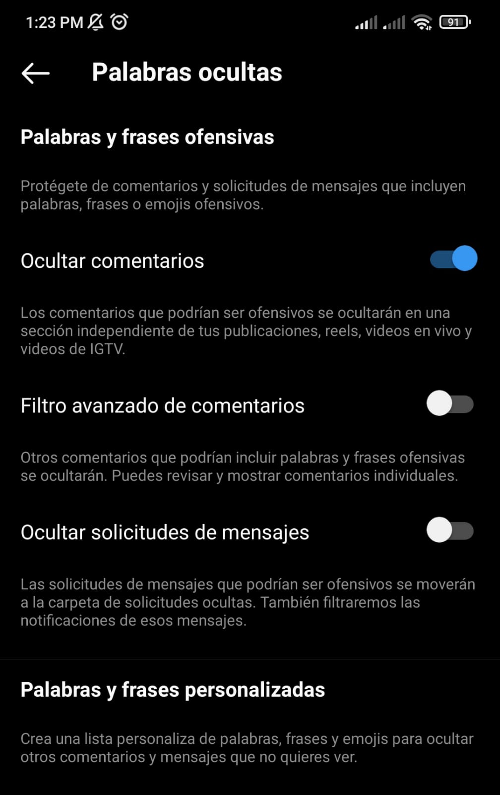 Este sistema permite filtrar las palabras ofensivas para proteger a los usuarios en caso de ser víctima de acoso. Se puede configurar un listado de palabras personalizadas, así los comentarios con estas palabras se ocultarán.