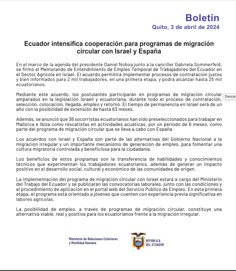 Mediante este acuerdo, los postulantes participarán en programas de migración circular amparados en la legislación israelí y ecuatoriana, durante todo el proceso de contratación, selección, colocación, llegada, empleo y retorno, detalla el comunicado de Cancillería.