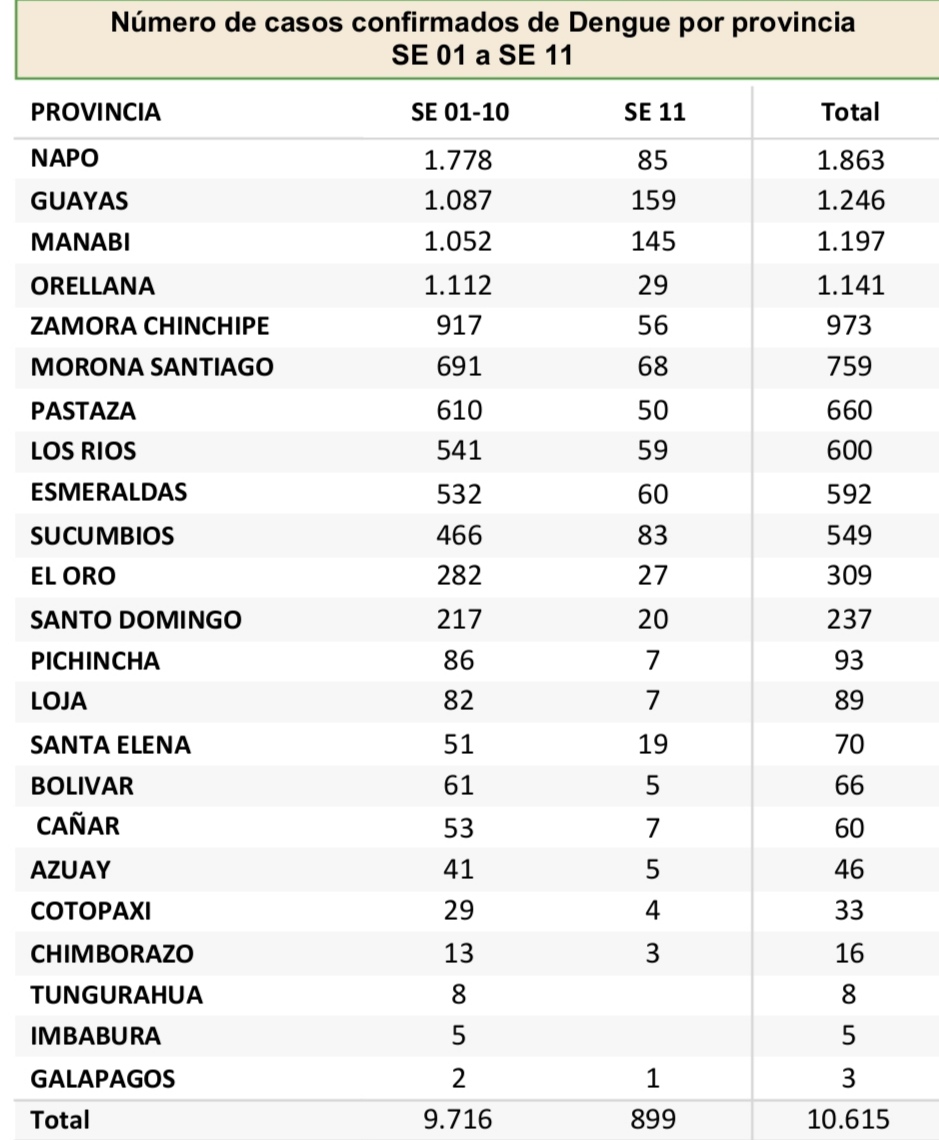 En Ecuador, el número de casos de dengue alcanzó los 10.615 diagnósticos positivos; siendo cuatro las provincias que concentran mayor cantidad de personas contagiadas. Estas son Napo, Guayas, Manabí y Orellana.