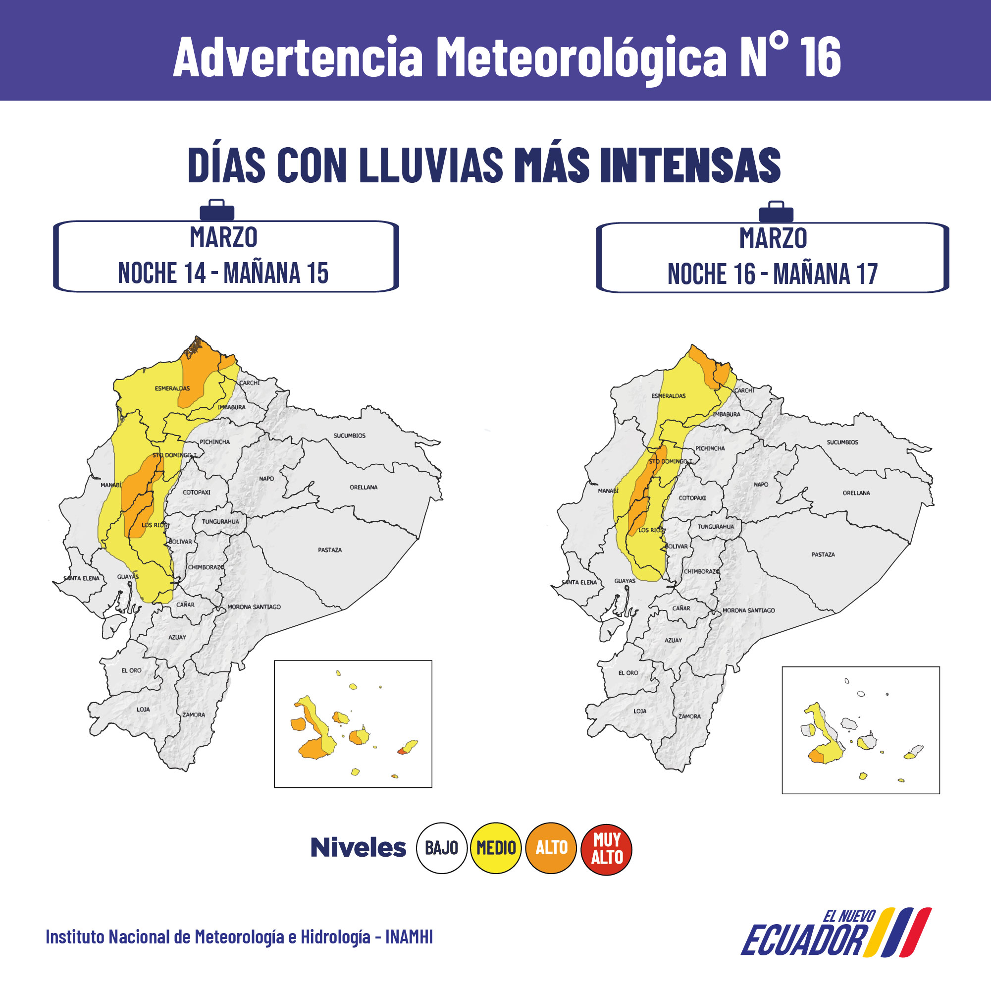 Según el último informe compartido por el Instituto Nacional de Meteorología e Hidrología (Inamhi), hasta el próximo domingo 17 de marzo de 2024 se prevén lluvias de moderada y puntual alta intensidad, con mayor énfasis en la región Insular, norte e interior de la región Litoral y estribación de cordillera occidental.