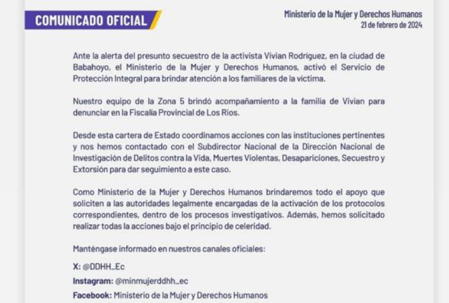 El Ministerio de la Mujer y Derechos Humanos se pronunció a través de un comunicado y ratificó que brindan atención a los familiares de la activista. Recalcan que, el personal de la institución ayudó a poner la denuncia en la Fiscalía de Los Ríos.