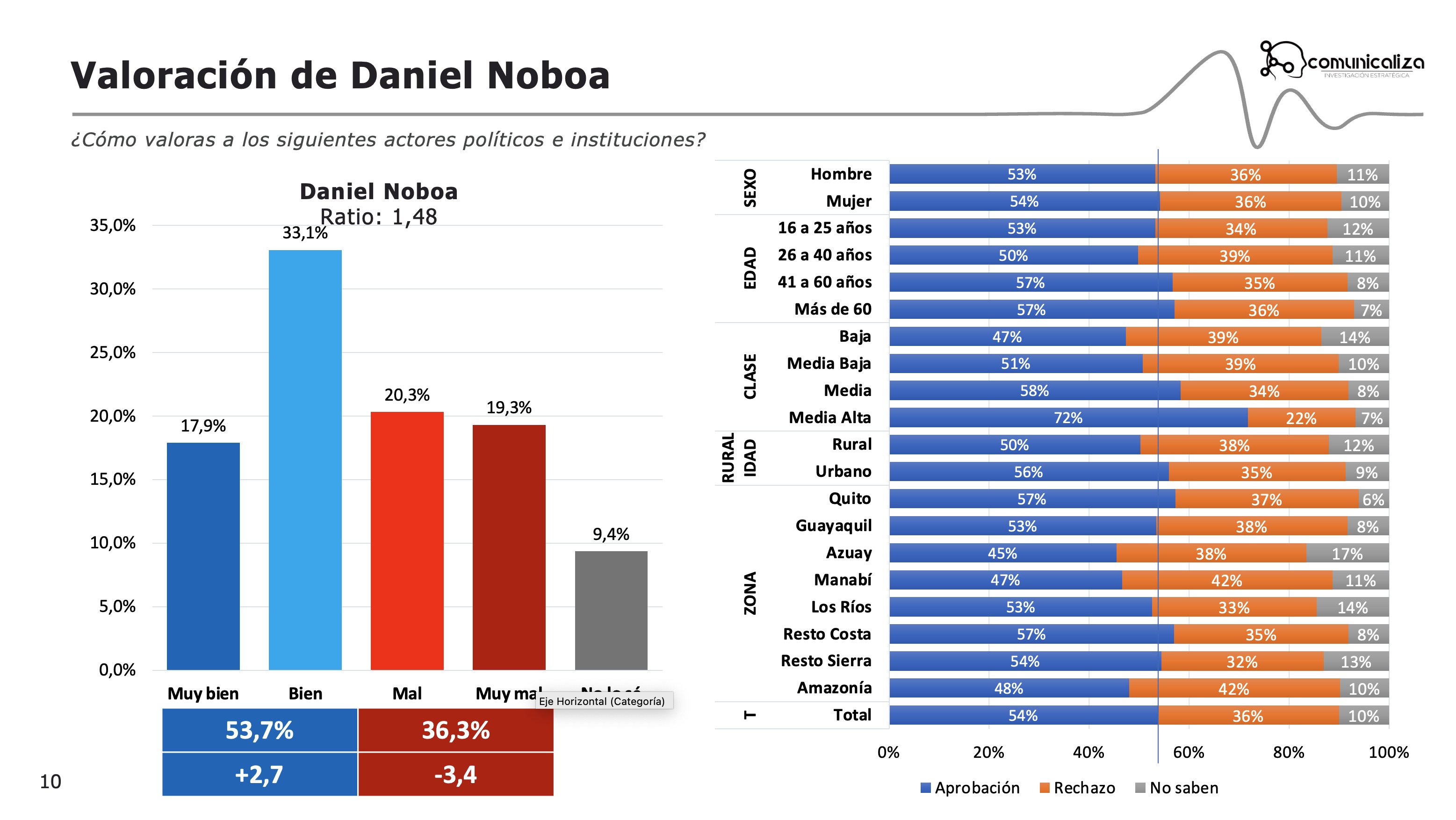 El presidente Daniel Noboa cerró el 2024 con un 53,7% de imagen positiva, según una encuesta difundida el 31 de diciembre de 2024 por Comunicaliza.