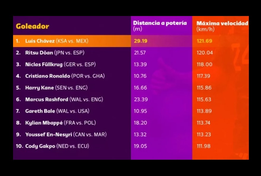 Es así que, en lo que va del torneo, el gol más potente fue el convertido por el mexicano Luis Chávez, su remate de tiro libre fue a 121,69 kilómetros por hora. Este tanto fue el segundo en la victoria azteca frente a Arabia Saudita, en la tercera y última fecha de la zona de grupos.
