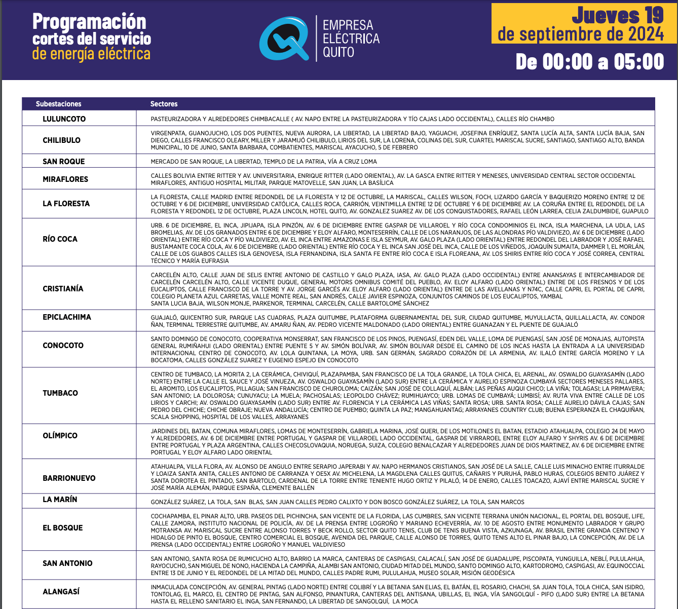 ? #EEQInforma | Te presentamos los horarios y sectores de suspensiones eléctricas previstas para hoy, miércoles 18 y jueves 19 de septiembre de 2024, en el siguiente enlace: