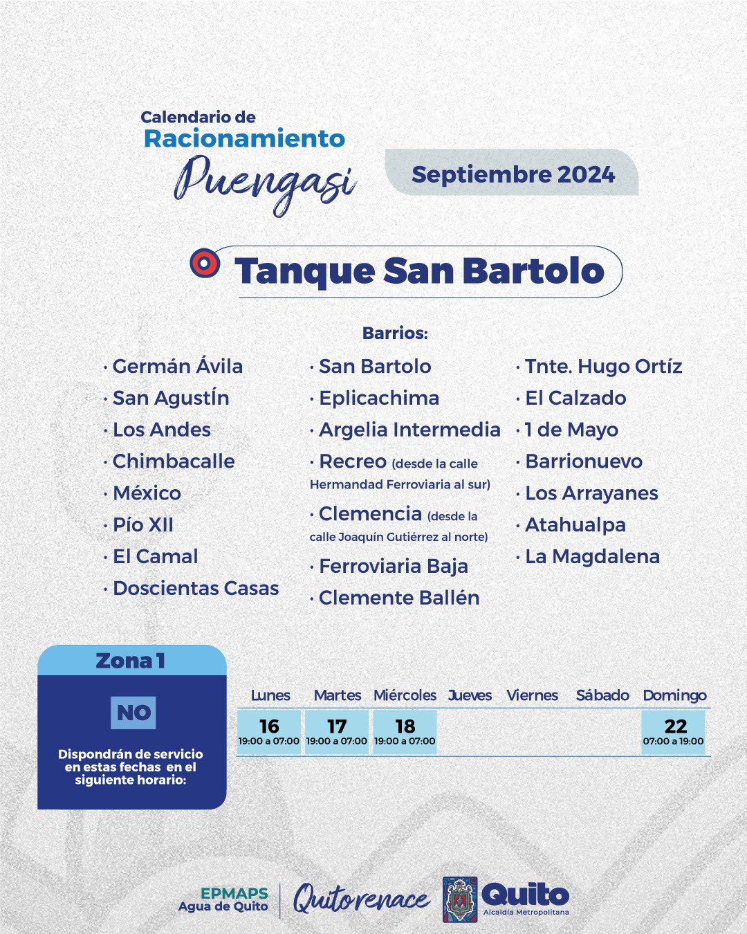 Los 22 barrios que se abastecen del agua con el tanque San Bartolo tendrán cortes cuatro días de esta semana: La suspensión del servicio será de 19:00 a 07:00 y de 07:00 a 19:00.