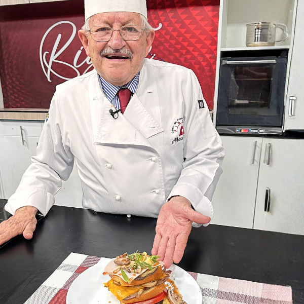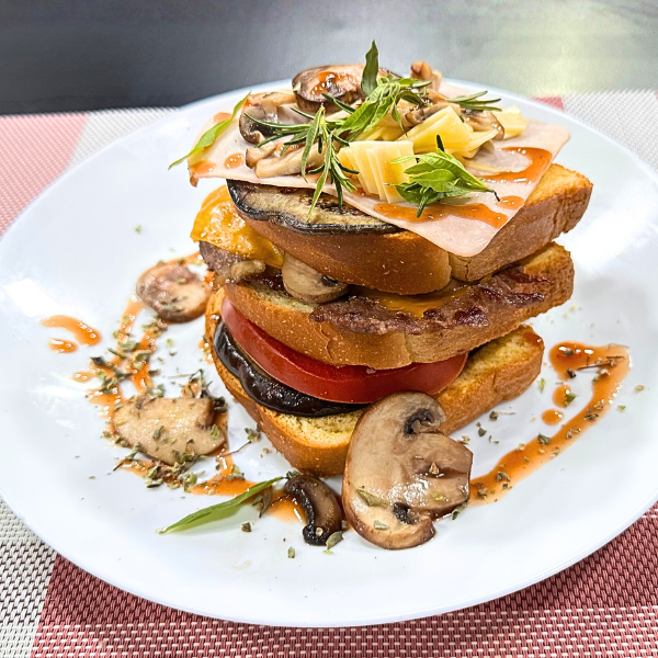 - En un plato y comience montando una rebanada de pan, cubra con una rodaja de berenjena, deposite una rodaja de tomate, ahora coloque una rebanada de queso cheddar. Cubra con la segunda tapa de pan, coloque otras rebanadas de: jamón y queso gruyere, agregue el filete de lomo y con los champiñones. Termine con una tercera tapa de pan, colocando una rodaja de berenjena, una rebanada de queso gruyere, una porción de champiñones. Salpique la parte superior con el aderezo. Decore con las hojitas de cedrón y romero, termine la preparación depositando un poco de aderezo en el contorno del plato.