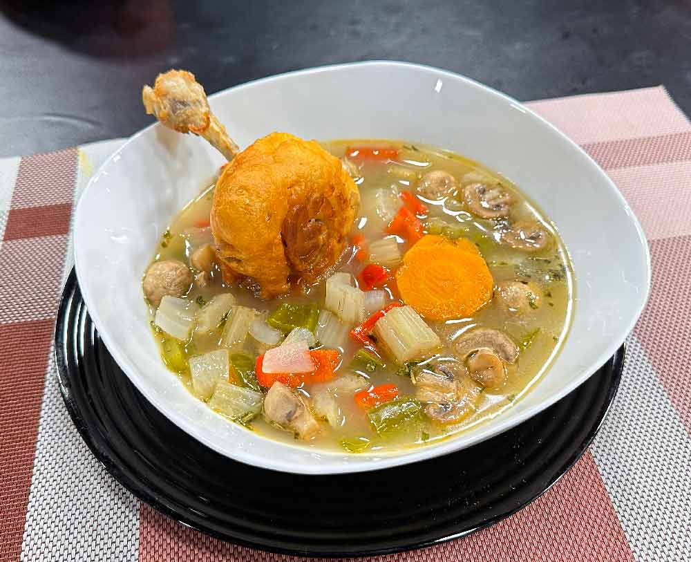 - Sirva la sopa teniendo, la precaución de que estén todos los ingredientes muy bien distribuidos, colocando una pierna de pollo, hojitas de estragón y una cucharita de aceite por cada comensal.