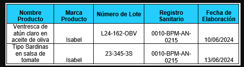 Se trata de los lotes de atún en aceite de oliva y sardinas en salsa de tomate de la marca Isabel. La información de los lotes a continuación.