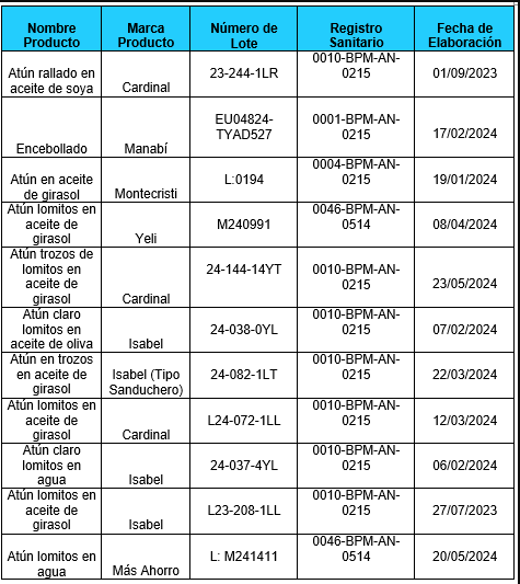 Arcsa hace un llamado a quienes adquirieron estos enlatados a revisar el número de lote. Si se trata de los lotes mencionados, no consuma estos productos.