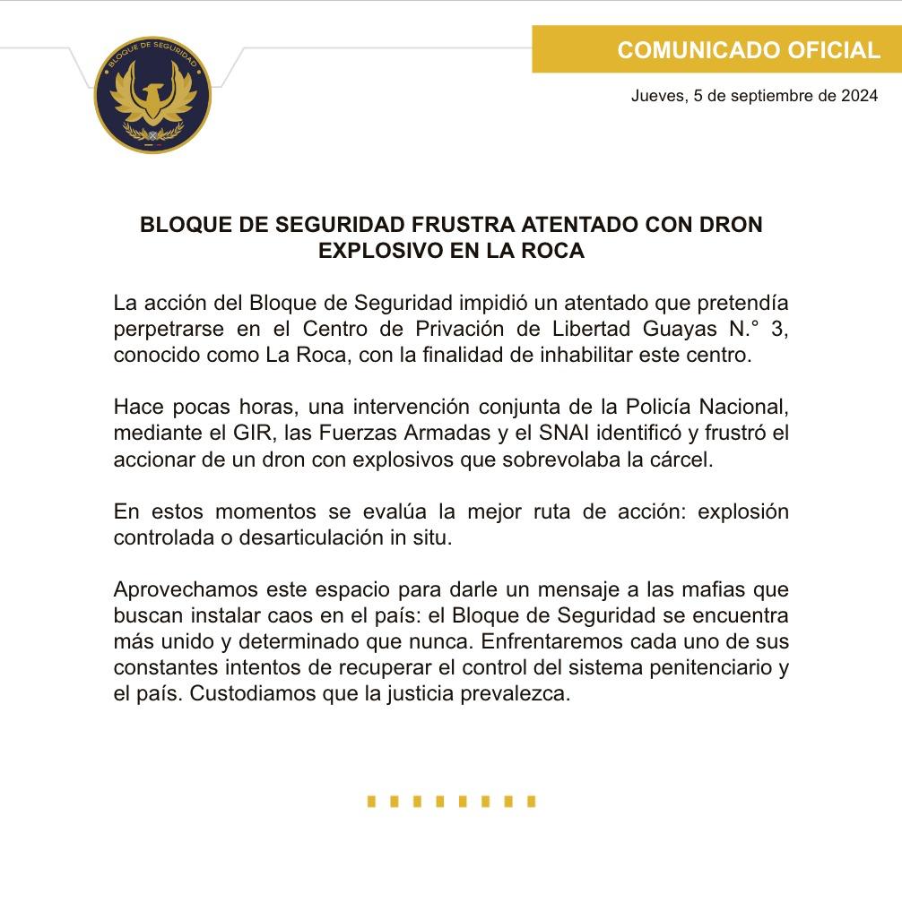 En el comunicado se explica que se dio una intervención por parte de la Policía Nacional, mediante el Grupo de Intervención y Rescate (GIR), las Fuerzas Armadas y la Servicio Nacional de Atención Integral a Personas Adultas Privadas de la Libertad y a Adolescentes Infractores (Snai). Los equipos identificaron y frustraron el accionar de un dron con explosivos que sobrevolaba la cárcel.