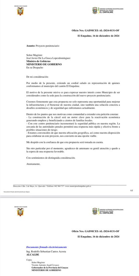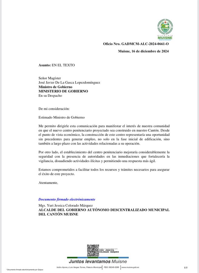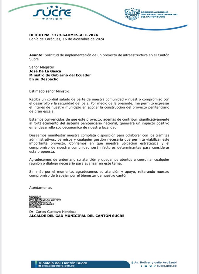 Mediante oficio, los alcaldes de Muisne - Esmeraldas, El Empalme - Guayas y Sucre - Manabí, pidieron al ministro de Gobierno, José de La Gasca, el traslado de la construcción del centro penitenciario, así lo señala Radio Centro. Los Municipios aseguran que la construcción del centro penitenciario representa una oportunidad económica importante para sus localidades y recalcaron la intención de apoyar el proyecto de seguridad.