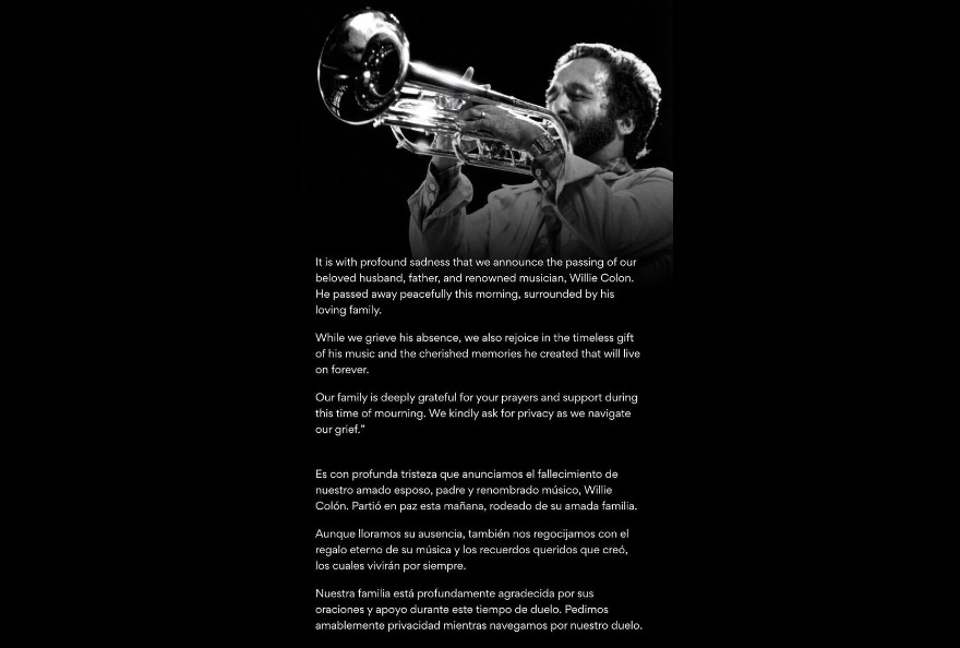El legendario trombonista y cantante Willie Colón murió este sábado 21 de febrero en Nueva York, según confirmaron sus allegados en un mensaje público.