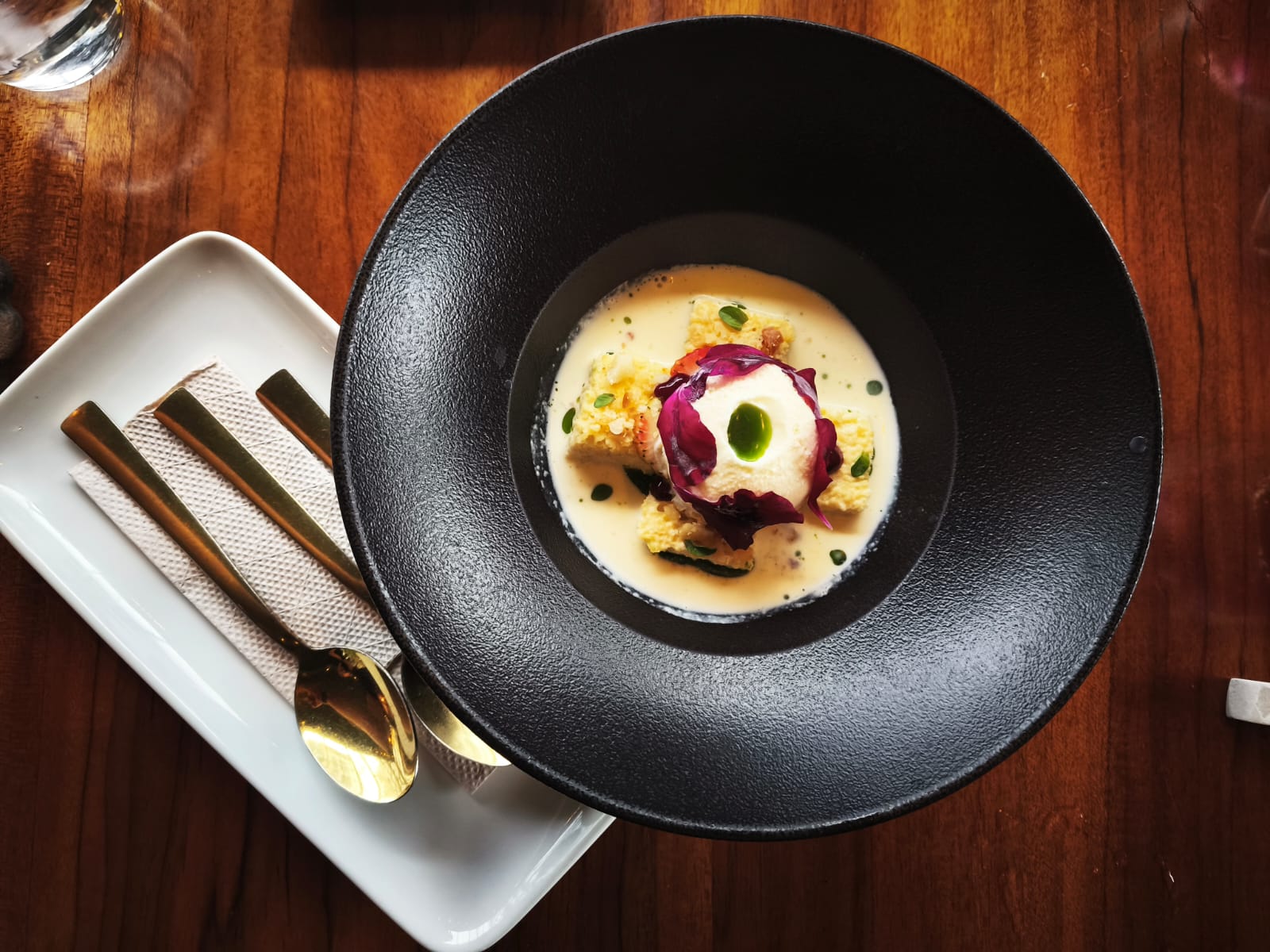 Sobre una mesa de madera iluminada con la luz de una tarde quiteña, tres empanadas de maíz morado aparecen como una declaración de intenciones. El color oscuro de la masa, el relleno de seco de chivo y el contraste entre lo crujiente y lo profundo marcan el inicio de un menú que no busca repetir la tradición, sino reinterpretarla.
